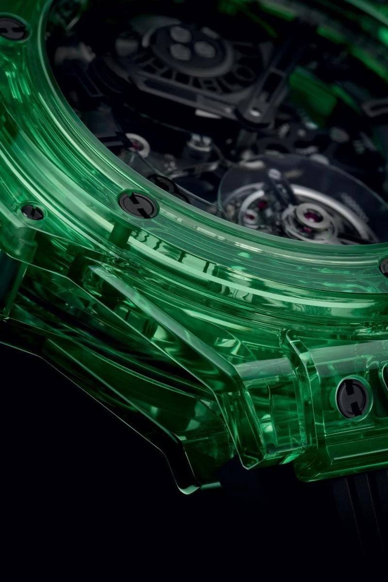 The Hublot Big Bang Tourbillon Automatic Green SAXEM is a revolutionary timepiece crafted in Green SAXEM (Sapphire Aluminium oXide and rare Earth Mineral), a cutting-edge sapphire-based composite with dazzling emerald transparency. Limited to only 18 pieces worldwide, it combines futuristic material innovation with the sophistication of an automatic tourbillon.
