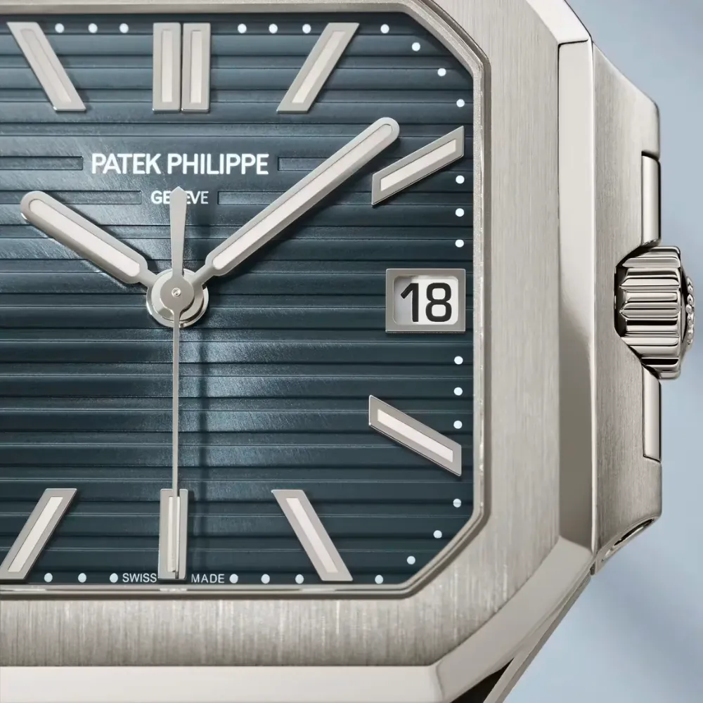The Patek Philippe Cubitus Ref. 7128/1G-001 refines the bold, square-with-rounded-corners silhouette of the Cubitus line into a more wearable medium size. Crafted in 18K white gold with an integrated bracelet and a textured blue-gray dial, it blends modern sport-chic character with Patek Philippe’s meticulous finishing.