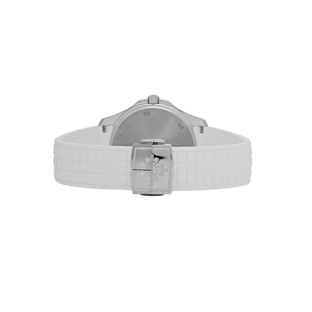 - Bracelet: White composite rubber strap with Aquanaut pattern and stainless steel fold-over clasp.