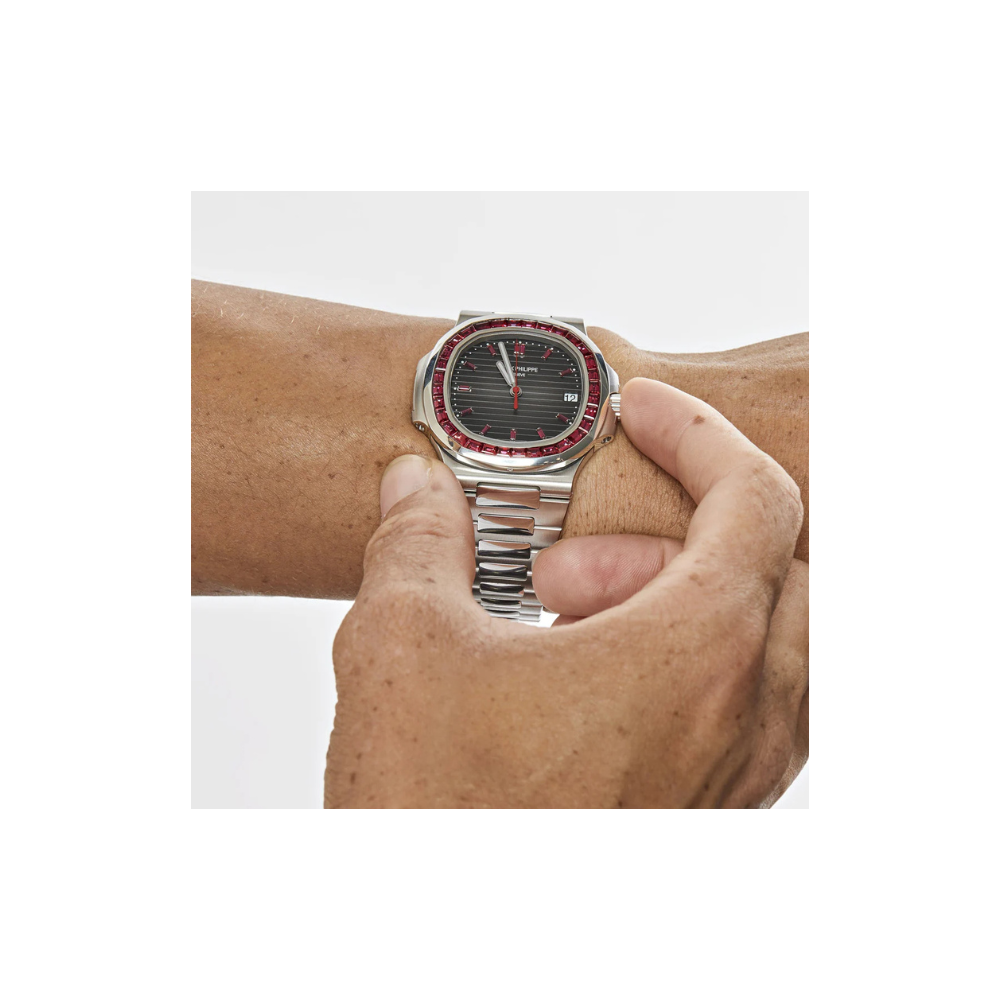 The Patek Philippe Nautilus 5711/112P-001 is a mesmerizing blend of technical mastery and gemstone artistry. Crafted from solid platinum, this ultra-rare edition of the Nautilus features a stunning ruby-set bezel paired with a sleek grey dial, offering a bold yet elegant presence. A symbol of exclusivity and refinement, this piece is destined for the most discerning collectors.