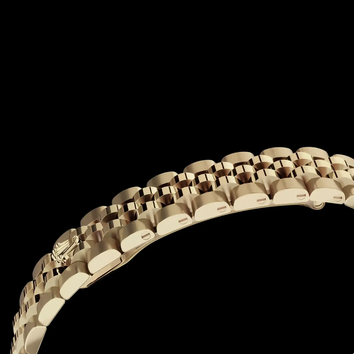 The 28 mm Oyster case crafted from Rolex’s high-grade 18 ct yellow gold envelopes the subtle champagne dial, which shines with diamond-set hour indexes framed in gold. The fluted bezel reflects light delicately, while the Jubilee bracelet (or optional President bracelet depending on variant) offers both flexibility and comfort.