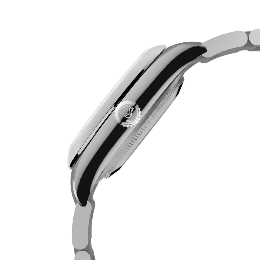 - Case: Oyster case in corrosion-resistant Oystersteel, 34 mm; monobloc middle case with screw-down case back and crown.