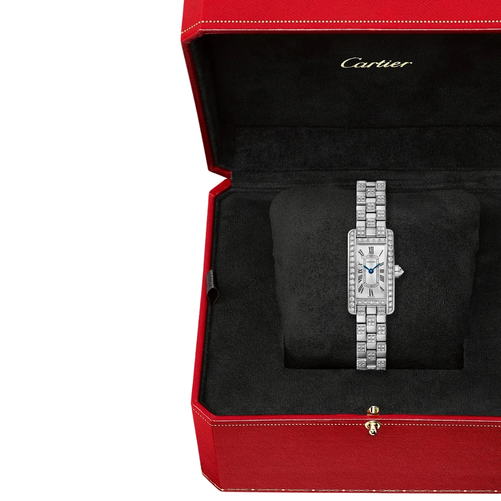 The Tank Américaine watch Ref. WJTA0067 is a glamorous reinterpretation of the elongated Tank design. Crafted in 18K rose gold and fully set with diamonds, this timepiece embodies Cartier’s balance of bold geometry and refined jewelry artistry. It is both a functional wristwatch and a radiant jewel, perfect for collectors who seek timeless sophistication.